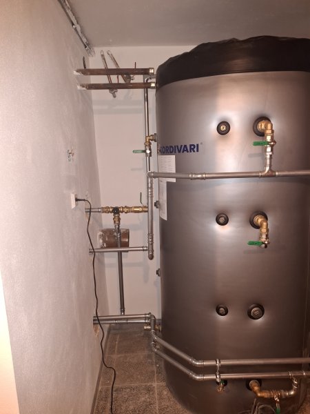 Součástí systému jsou dvě akumulační nádrže o objemu 2 × 1 000 litrů, bojler pro ohřev teplé užitkové vody o objemu 300 litrů a expanzní nádoba o objemu 200 litrů.