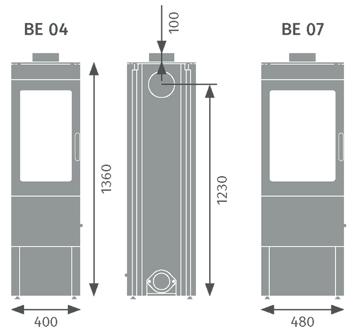 BLAZE ELEMENT stoves offer two flue connection options: variant – top outlet, and the Rear (R) variant – rear outlet. The stoves are also equipped with an external air supply (RA) connection, which can be connected either from the bottom or the rear side of the stove.