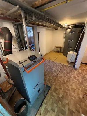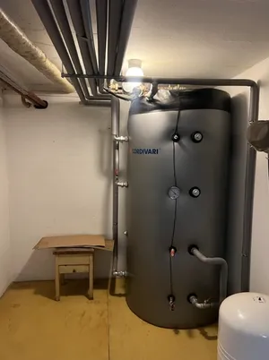 Dům, který se skládá ze dvou pater, podkroví a sklepa, je zateplený, což umožňuje lepší hospodaření s teplem. Nový systém zahrnuje akumulační nádrž o objemu 1000 litrů, která optimalizuje využití vyrobeného tepla a zajišťuje stabilní vytápění. Rozvody jsou řešeny dvěma hlavními okruhy – první směšovací okruh je řízen bezdrátovým termostatem, což umožňuje komfortní regulaci teploty, a druhý okruh slouží k ohřevu teplé užitkové vody (TUV).
