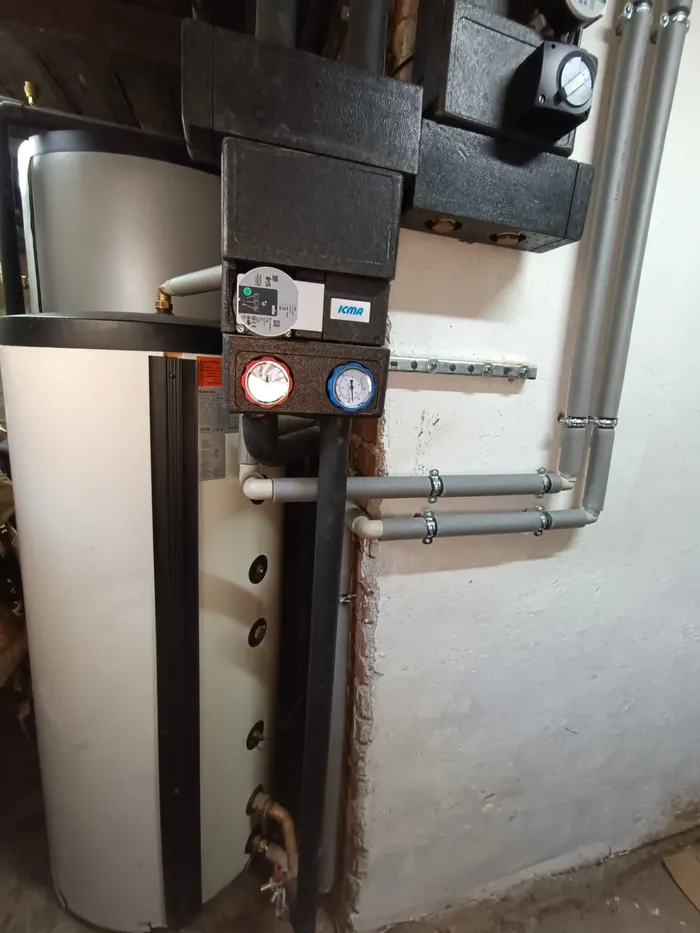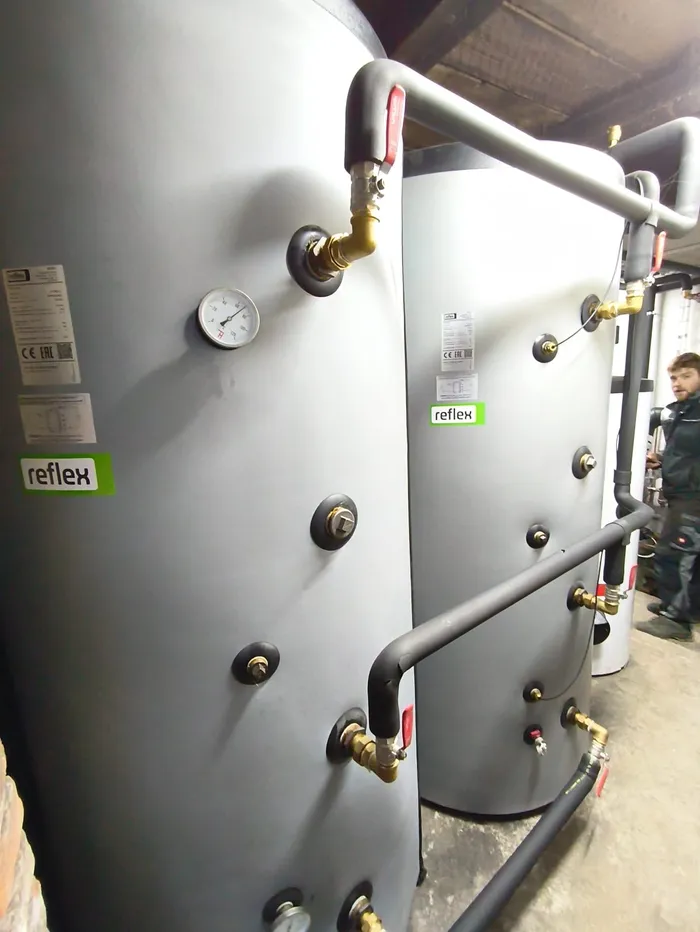 Topný systém zůstal napojen na stávající teplovodní rozvody, přičemž byl výrazně doplněn o akumulační nádrže. Konkrétně byly instalovány dvě nádrže Reflex HF 1000 s celkovým objemem 1842 litrů, které zajišťují efektivní ukládání tepla a vyšší komfort provozu. Systém je dále doplněn o bojler Dražice o objemu 300 litrů pro přípravu teplé užitkové vody a řízení pomocí pokojového termostatu eSTER_X80.
