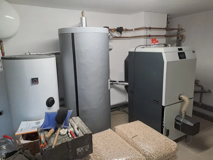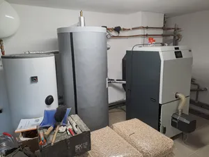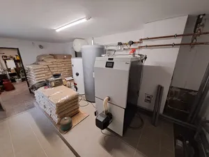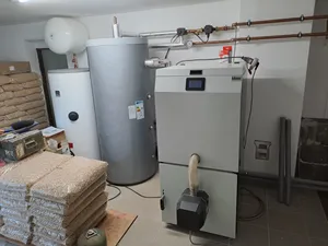 Byla realizována instalace peletového kotle BLAZE ROTARY PELL COMPACT 20, doplněného o akumulační nádrž o objemu 400 litrů a bojler o objemu 250 litrů pro ohřev teplé užitkové vody.