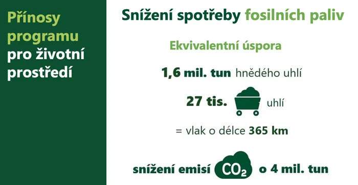- Energetické úspory: Program přispěl k úspoře téměř 42 tisíc TJ energie, což výrazně snižuje závislost na fosilních palivech.