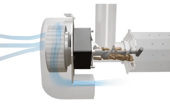 Najbardziej zaawansowana regulacja spalania peletów bez utraty wydajności. Kocioł RPC wykorzystuje dwa zintegrowane wentylatory z regulacją prędkości obrotowej, które precyzyjnie dozują powietrze i paliwo. Dzięki temu kocioł zachowuje stabilną wydajność przez cały sezon grzewczy, co znacznie obniża koszty eksploatacji.